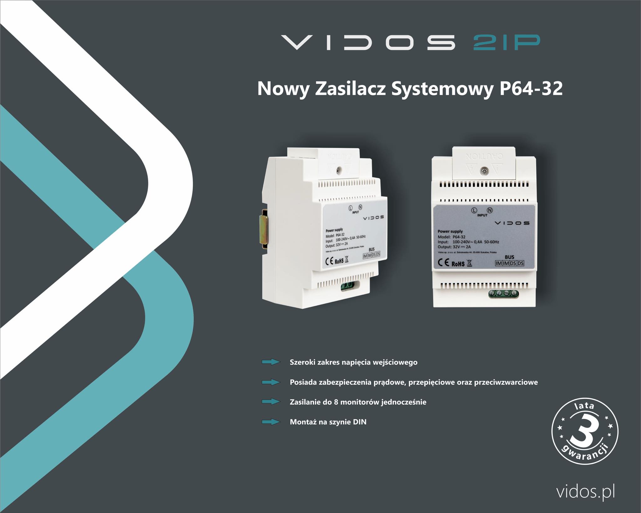 Do oferty został wprowadzony nowy zasilacz systemowy P64-32, dedykowany do dwużyłowego systemu Vidos 2IP. Urządzenie łączy funkcję zasilacza oraz separatora napięcia i sygnału, zapewniając stabilną i bezpieczną pracę systemu.